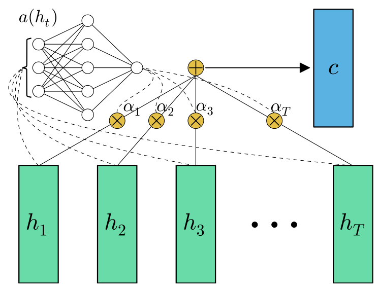 where is an alignment model which scores how well the input at the position $j$ and the output at position $i$ match [3]. Here $\text{score}$ is a simple FF-NN layer: