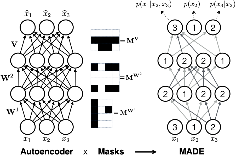 Masked Autoencoder Distribution Estimator (MADE) (Deepmind & Iain Murray)[3] masks the autoencoder’s parameters to respect autoregressive properties that each input only reconstructed from previous input in a given ordering.