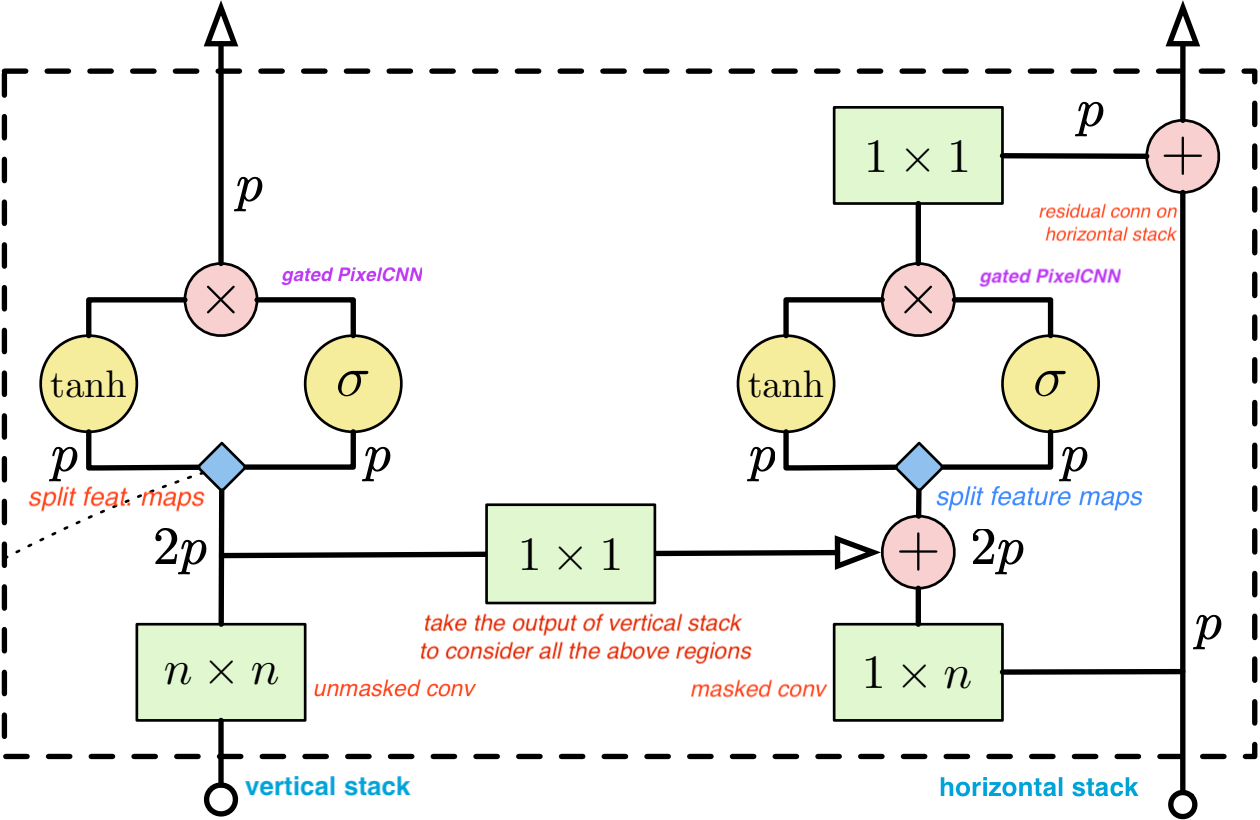where $p$ represents the # of feature maps, $\circledast$ denotes convolution operations, where it is masked in horizontal stack but unmasked in the vertical stack.