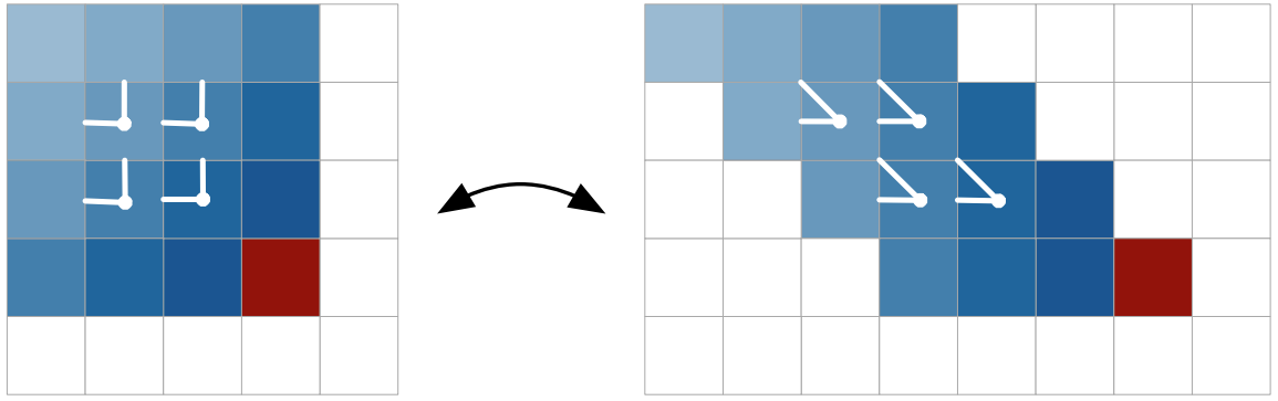Diagonal BiLSTM skews the input $\mathbf{x} \in \mathbb{R}^{n \times n}$ into $\mathbb{R}^{n \times (2n-1)}$ by shifting the $i$-th row with $(i-1)$ position offsets, i.e. each row is one position right shift compared with the previous row (see below figure).