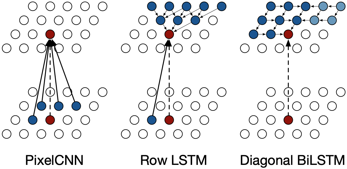 PixelCNN[1] adopts multiple conv layers without pooling to preserve the spatial resolution and masks the future context.