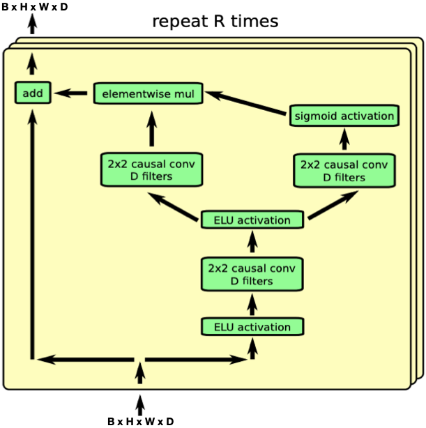 - It applies 2D convolutions with gated activation functions as gated &PixelCNN* and residual connections as the figure.