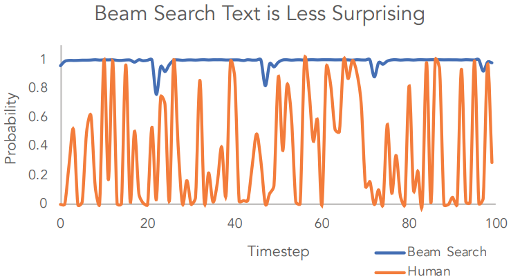 As shown in the figure, it shows a discrepancy between human- and model- generated word probabilities: repetition of text decoded by beam search w.r.t the probability of tokens generation, while that of human generated text is with variance.[5]