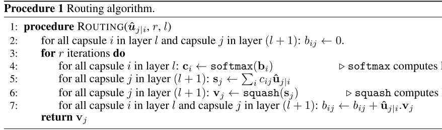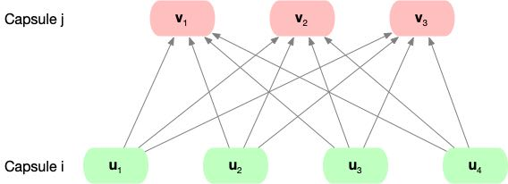 where coupling coefficients between capsule $i$ and all all capsules in the layer above are scaled with a “routing softmax” to sum to 1. We will introduce this in the next section.