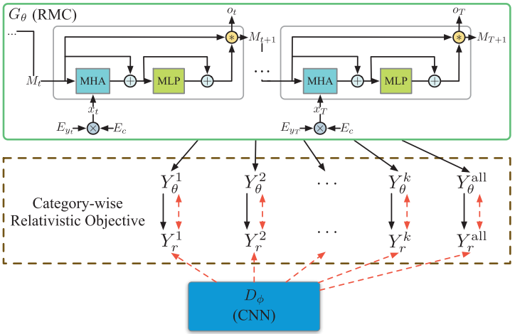 RelGAN[13] employs a relational memory based generator; Gumbel-softmax trick; and multi-representations in $D$.