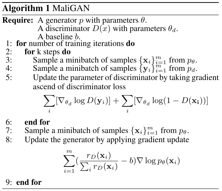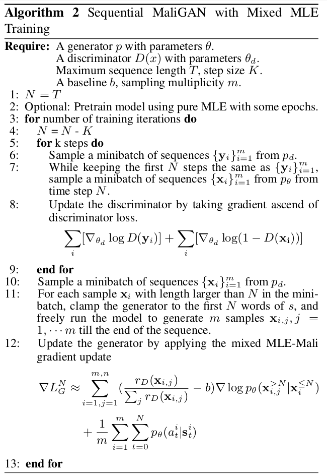 | MaliGAN (MILA) | ✔ | ✘ | ✘ | ✘ | ✘ | ✔ | LSTM | CNN |