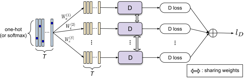 RelGAN applies multiple embedded representations for each input with each independently passed through CNN-based classifiers to get the score. Finally, take the average of different representations as the final guiding signal to update $G$. This resembles the use of multiple discriminators in image GANs but keeps a weight-sharing CNN-based classifier to curtail the computational cost.