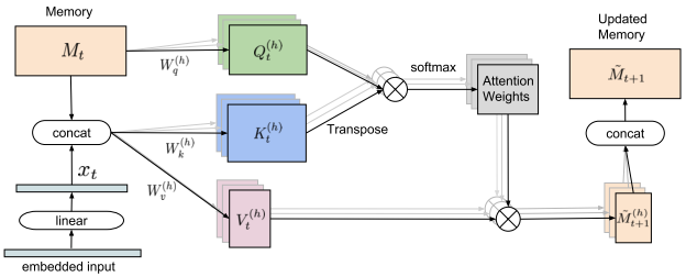 As below figure, let each row of the memory denote a memory slot. Given input at time $t$ and $H$ heads, the memory is updated with self-attention mechanisms.