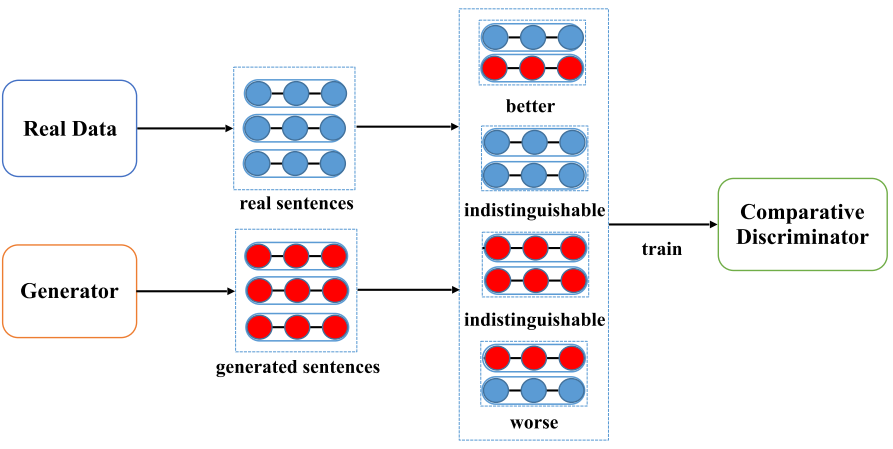 SALGAN[17] employs a comparative discriminaor to pairwisely compare the text quality between a pair of samples: better($>$), worse ($<$), or indistinguishable ($\approx$). Given a training set with $n$ real samples and $n$ generated samples, the comparative discimination can construct $\binom{2n}{2}$ pairwise training examples.