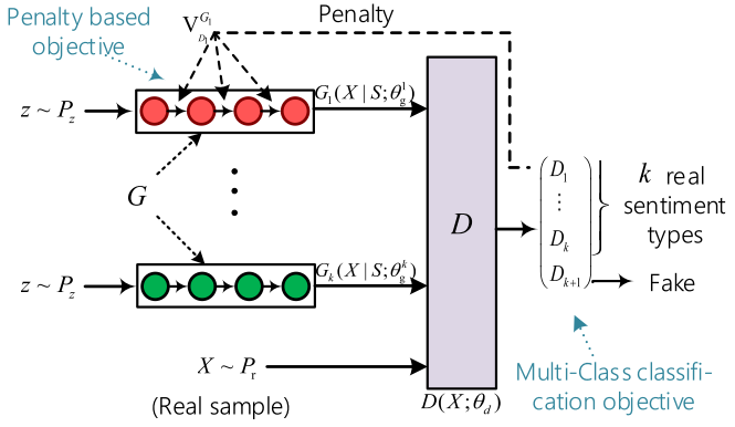 $D$ is a CNN-based multi-class discriminator, producing a ${k+1}$-dimensional probability vector. The score at $i$-th ($i \in {1,\cdots,k}$) index represents the probablity of being the $i$-th sentiment, the $(k+1)$-th index denote the probability to be synthetic.