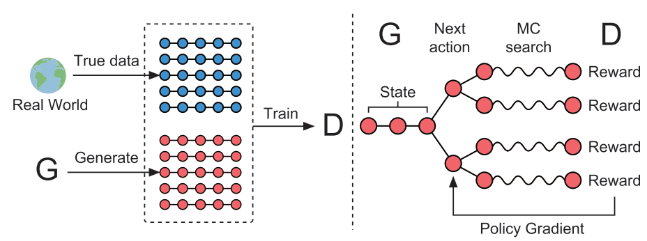 SeqGAN[1] bypasses the generator differentiation problem by directly performing a policy gradient update, which adopts the judgments of $\mathcal{D}$ on the complete generated sequences as reward signals using Monte Carlo (MC) search.