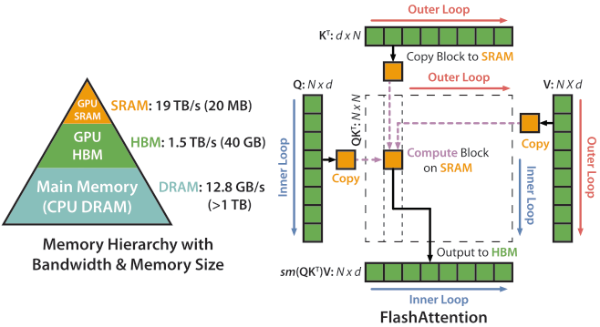 Flash Attention[11] reduces the frequency of visiting HBM and use tiling computation on self-attention computation. It uses K/V tiling in the outer loop and Q in inner loop in Flash Attention 1, and uses K/V for the inner loop to reduce the frequent SRAM visit.