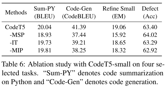It is observed that removing MSP can largely reduce the generation task performance but instead increase the defect detection performance, indicating that MSP can capture syntactic information for generation tasks.