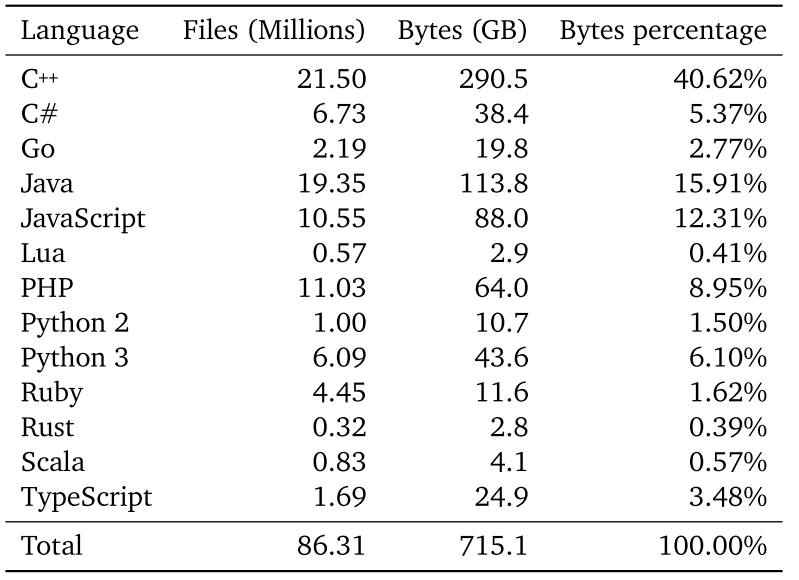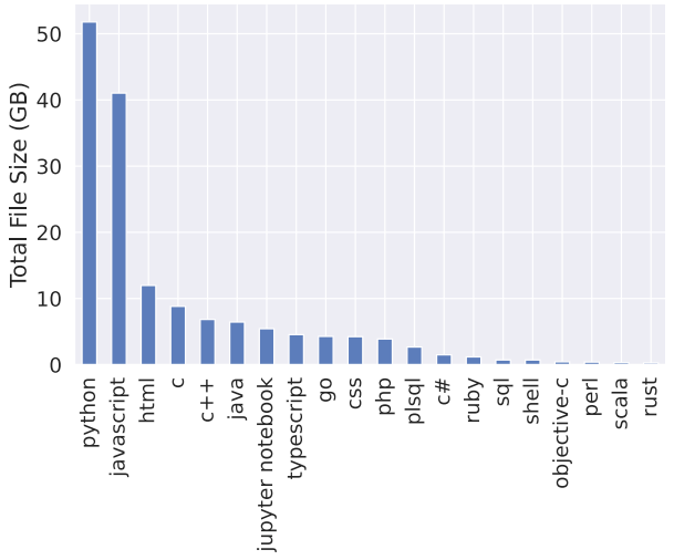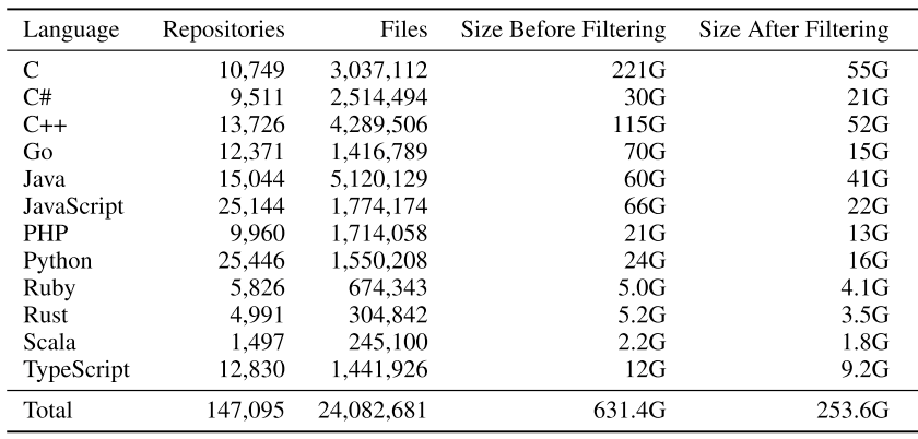 - Data: GitHub repos including several popular languages. It follows Codex to filter out all files larger than 1MB or with lines longer than 1000 characters, to exclude automatically generated code. It also remove duplicates of the same file, ignoring whitespace in comparisons. It has 715.1GB code intotal.
