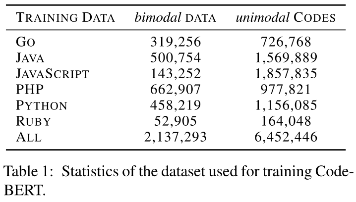| CodeBERT | EMNLP’20 findings (MSRA) | 125M | ✔️ | ✔️ | BBPE | fine-tuned RoBERTa | 6 | CodeSearchNet (6 PL languages) | |||