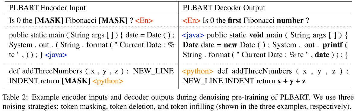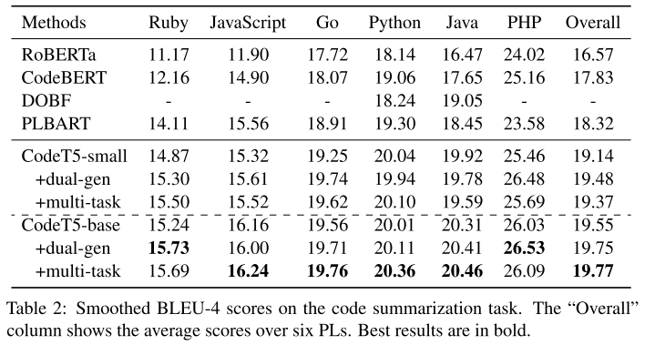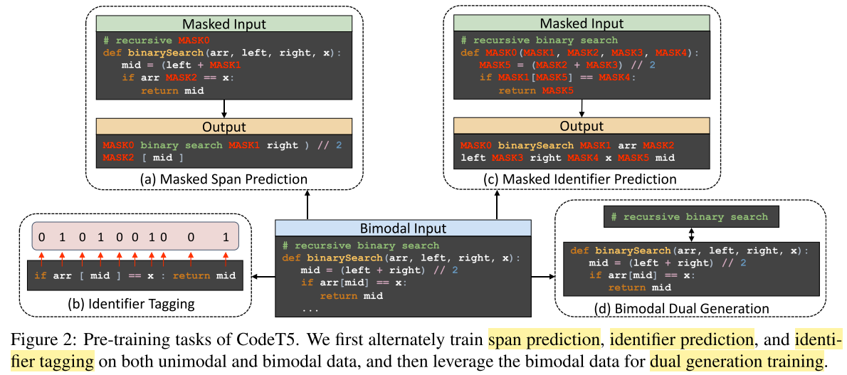 - Bimodal dual generation. Train NL $\rightarrow$ PL and PL $\rightarrow$ NL generation simultaneously, which can be seen as a special case of T5’s (full) span masking.