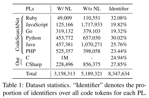 | SynCoBERT | AAAI-22 | 125M | ✔️ | ✔️ | ✔️ | BBPE | CodeBERT init. | 6 | CodeSearchNet | ||