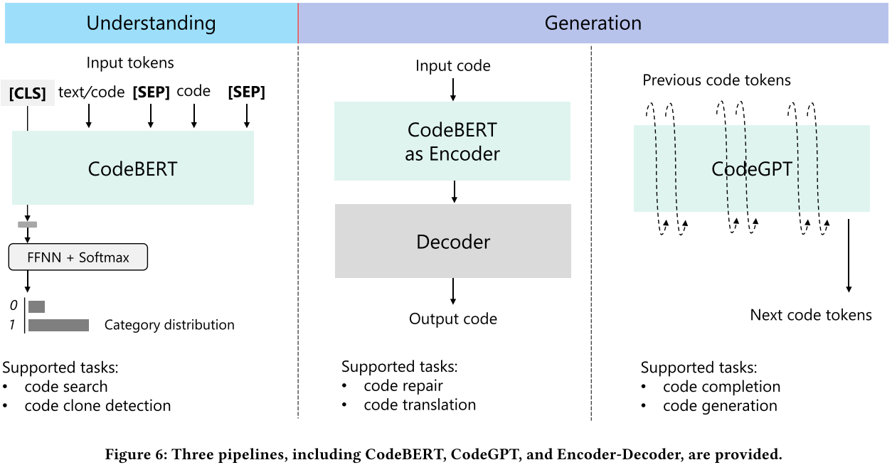 - Code completion: Predict following tokens based on a code context. Two subtasks: (1) token-level completion: check whether the next token has been predicted correctly; (2) line-level completion: test the goodness of the generated line.
