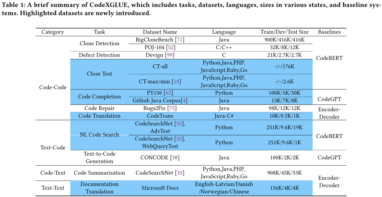 CodeXGLUE[5] includes 14 datasets, consisting of 10 diversified PL understanding and generation tasks.