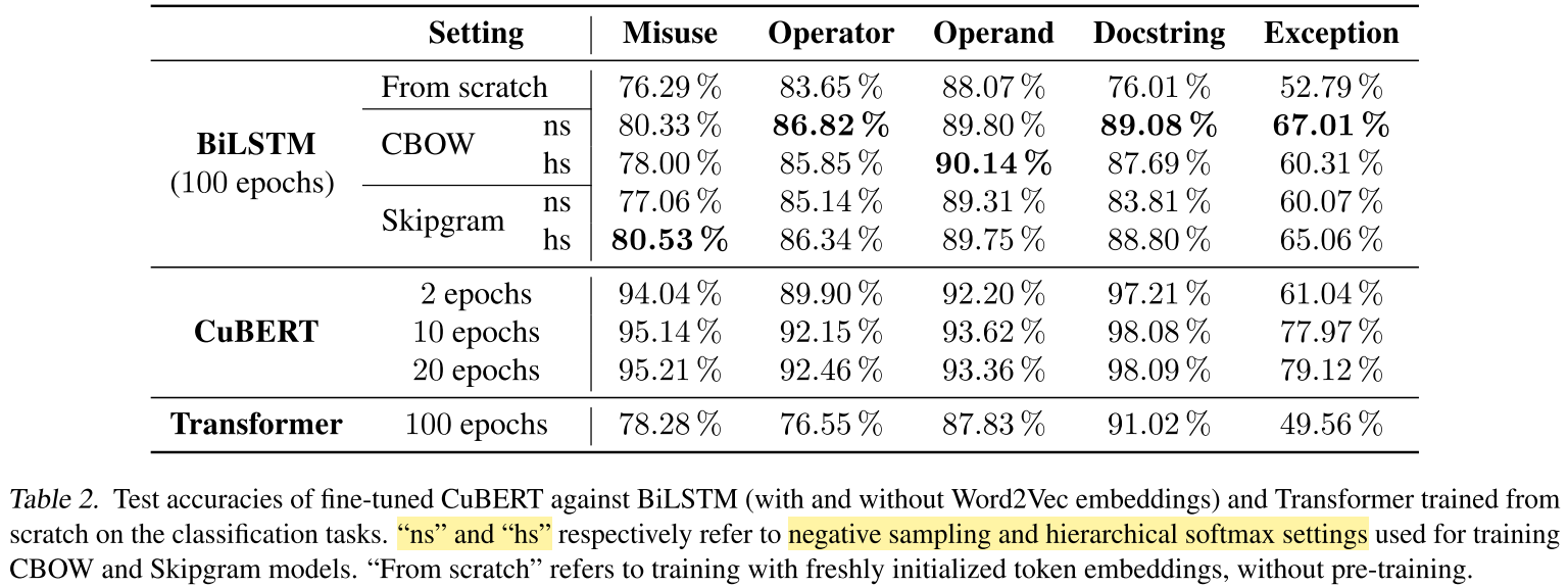 Background: There is no attempt yet to obtain the high-quality contextual embeddings of source code, and evaluate it on multiple program-understanding tasks simultaneously. That is the gap that CuBERT aims to mitigate.