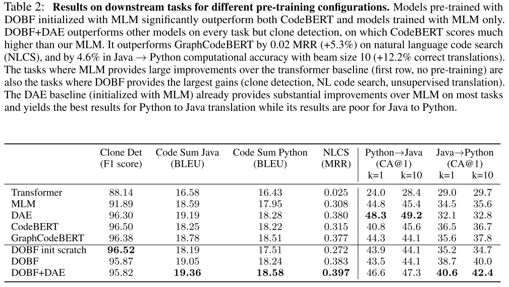 | DOBF | NeurIPS’21 (FAIR France) | base | ✔️ | code obfuscation | both | BBPE | CodeBERT init/ from scratch | 2 | Python/Java files in GitHub repo from Google BigQuery | ||