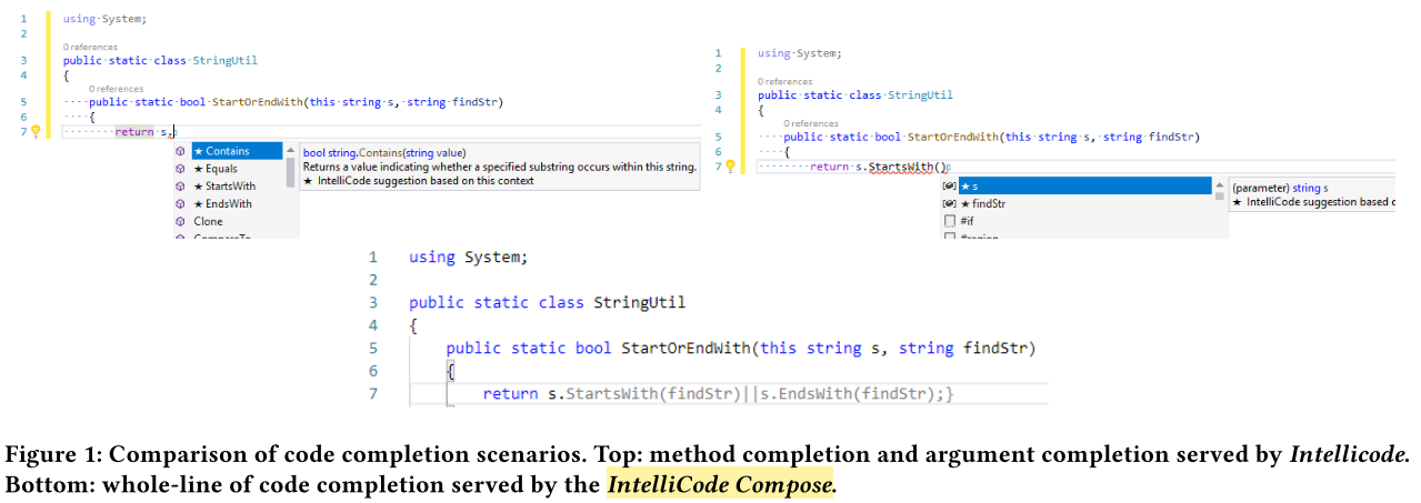 - Motivating Example: The example below shows an method completion and an argument completion in C Sharp PL served by the Intellicode extension in Visual Studio IDE, and the whole-line of code completion generated by IntelliCode Compose.