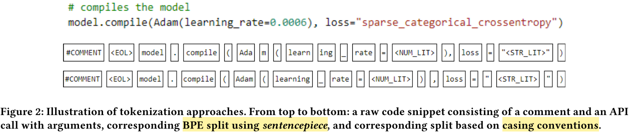 - BPE tokenization. It uses sentencepiece tokenizer with special tokens for control flow and code structure representations. For control flow tokens <BOF> and <EOF> to mark the beginning and ending of a file in order to disambiguate similar identifier names in different files, and <EOL> to mark the ending of a line. Since python uses white-spaces and indentation to demarcate code scope, [4] introduces <INDENT> and <DEDENT> tokens to represent those scope delimiters.