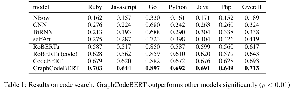 | GraphCodeBERT | ICLR’21 (MSRA) | 125M | ✔️ | data flow | ✔️ | BBPE | CodeBERT init. | 6 | CodeSearchNet (6 PLs) | ||