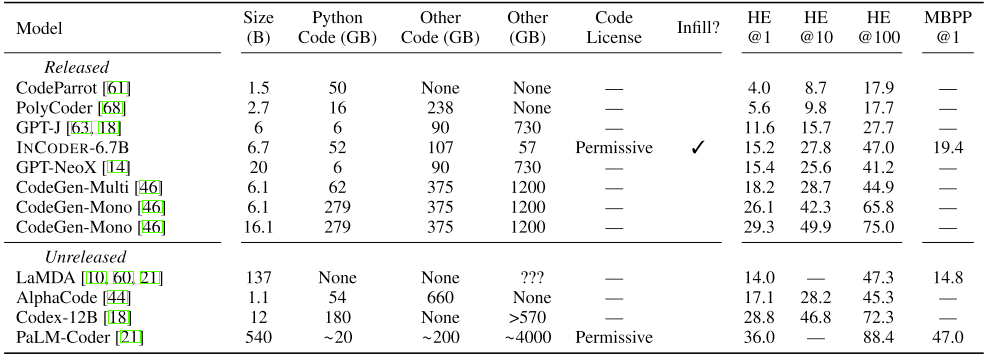 | InCoder | Meta AI | 6.7B | ✔️ | - | - | BBPE | Decoder | 28 | 1TB -> 250GB. GitHub and GitLab via API. | ||