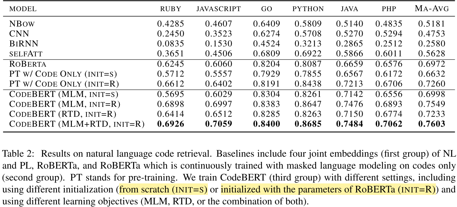 - NL code search: “Init=S” vs. “Init=R” $\rightarrow$ RoBERTa warmup confers performance gain. This observation is different from OpenAI Codex!!