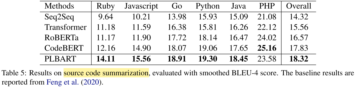 - Code summarization: generate the NL comment for a code.