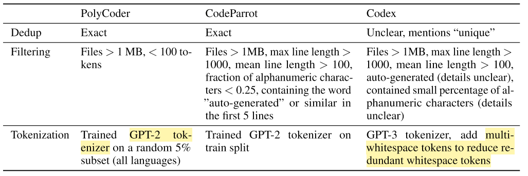 | Codex | OpenAI | 12B | ✔️ | - | ✔️ | BBPE | fine-tuned GPT-3 | 1 | 159GB python files after filtering. | ||