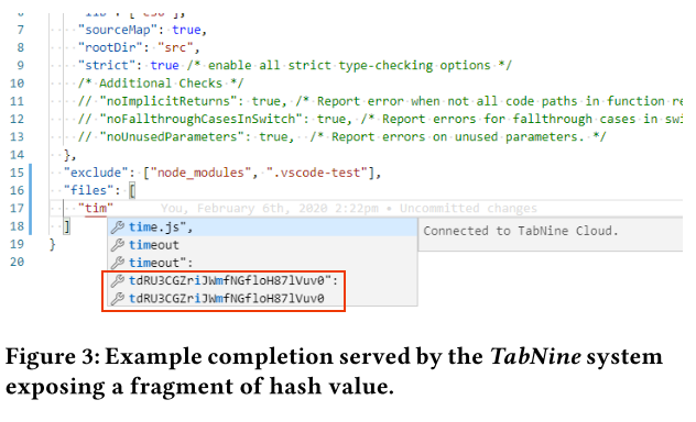 Exposing sensitive data through code suggestions. The figure shows an example completion served by the TabNine system exposing irrelevant and potentially sensitive data.
