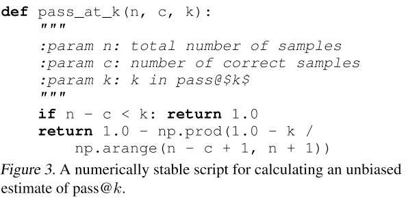 Pass@k metric: First generate n ≥ k samples per task, count the number of correct samples c ≤ n which pass unit tests, and calculate the unbiased estimator.